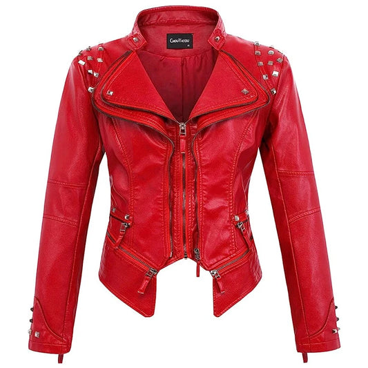 Black Washed PU Leather Jacket - 2026 Spring Suit Collar Rivet Detail