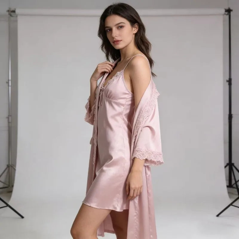 2-Piece Lace Pajama Set - V Neck Nightgown & Robe